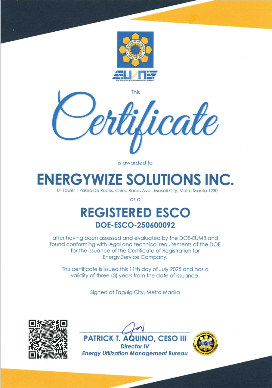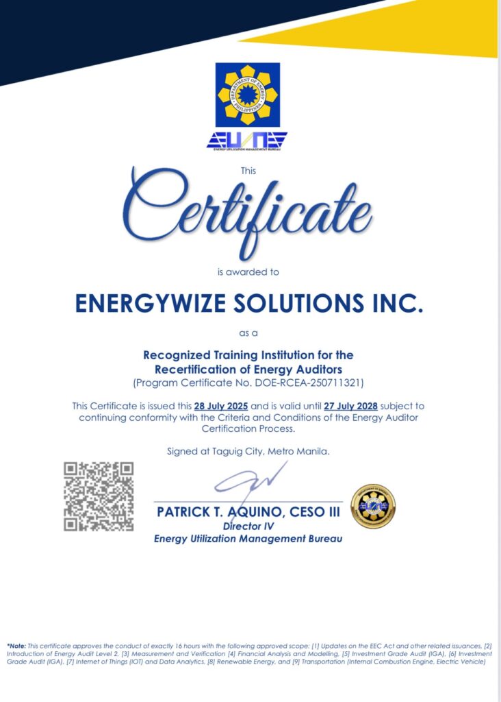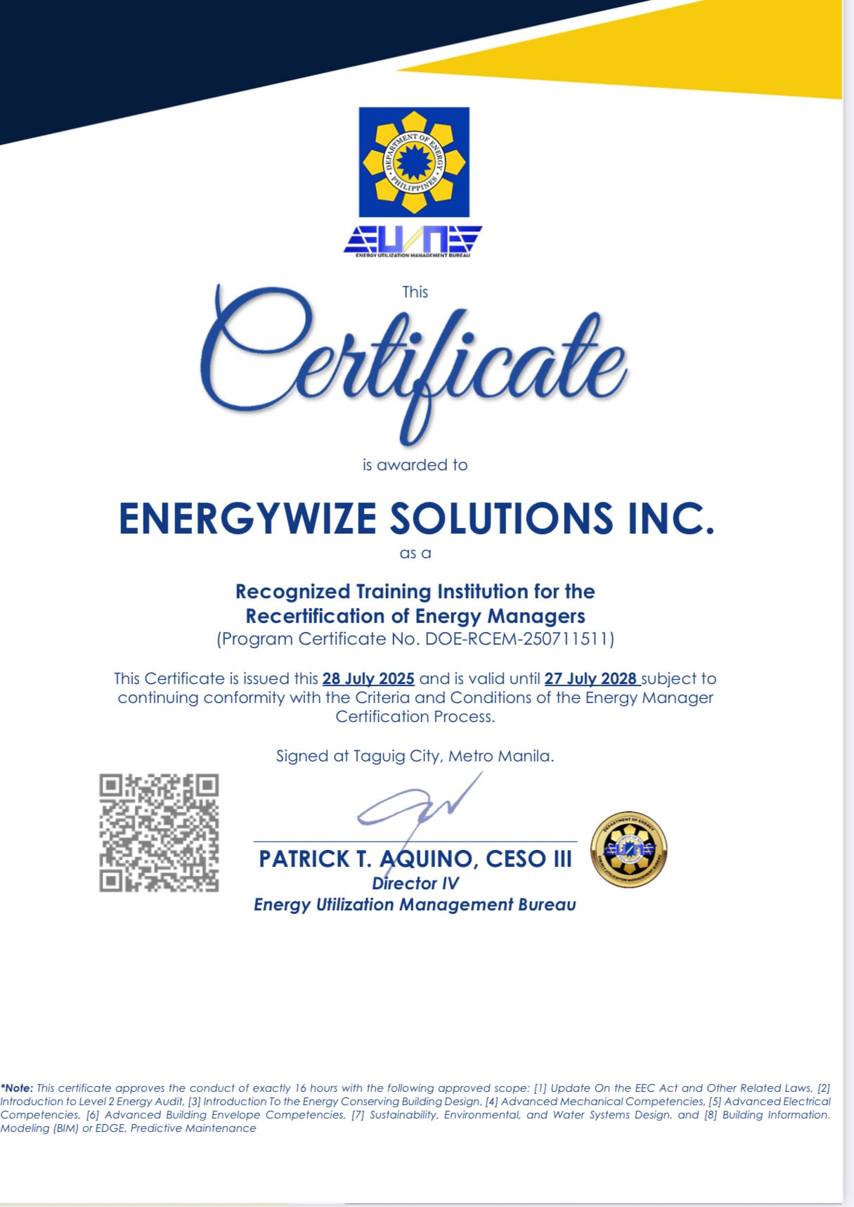 Technical Training and Education EnergyWize Solutions is proud to be a DOE Recognized Training Institution, offering specialized training programs designed to enhance the skills and knowledge of professionals in the energy management sector. Our training programs are tailored to meet the needs of individuals and organizations seeking to improve their energy efficiency practices and achieve certification in various energy management disciplines.